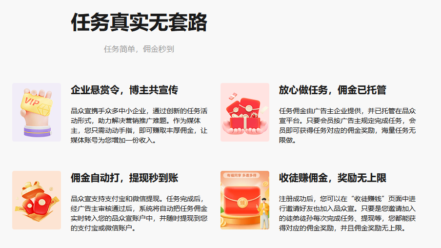选择网络种草,一方面可以让你把好的产品分享给大家,另一方面如果和一些品牌合作,也可以给自己带来一些收益。我就在品众宣这个平台上接到很多网赚接单任务,加入平台创建的Q群(群号:663626508),每天群主会不定时的发布一些种草任务,任务真实无套路,而且不用撰写文案,不用制作图片等,文案+图片均由平台提供,我只需要动动手指,在我的自媒体账号发布一下就可顺利完成任务,每单可以拿到金额不同的红包。每天接一单,一个月的零花钱就妥妥的有了!